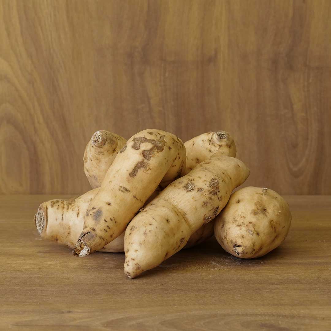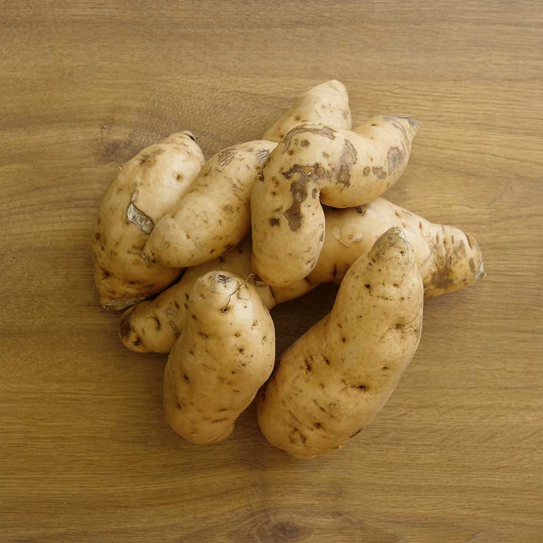 Cream-skinned, white-fleshed sweet potato with dry, starchy flesh that cooks fluffy and mildly sweet with an earthy finish.